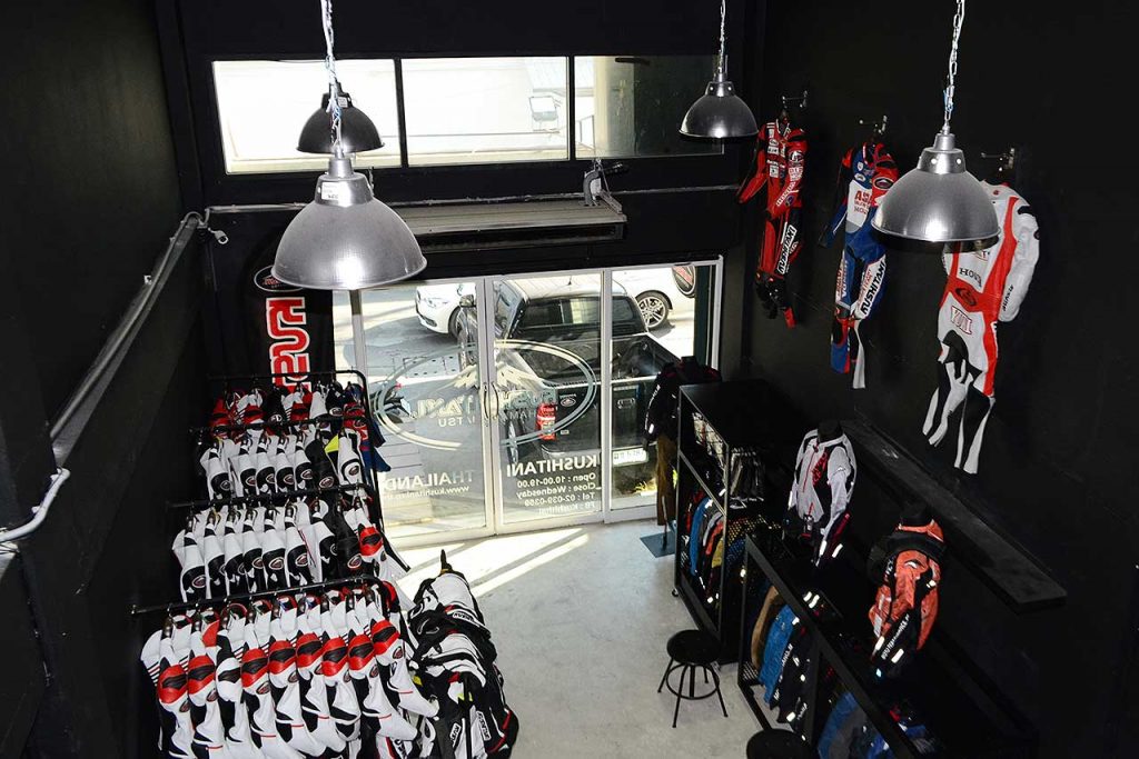 レーシングサービス以外で、クシタニがタイでどのような展開をしているのかご紹介しましょう。ホンダビッグウイング様の店舗内では、ライディングギヤやレーシングスーツ展開しています。ここでしか購入できないジャケットなども販売中です。