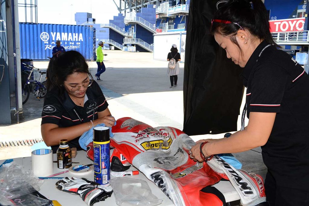 「ARRCのレーシングサービスでは、基本的に接着剤や塗料を用いてライダーがレースを走れる状況を作ります。あとはワッペンなどの交換ですね。タイラウンドの場合はミシンでの修理を行い、タイ以外のラウンドではKushitani Thailandで修理を行います」