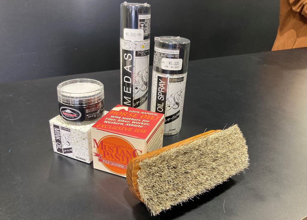 ミンクオイル、ジャーマンブラシ2、クシタニレザークリーム、アメダス、レザリアンなどを扱っておりますので参考にして下さい。