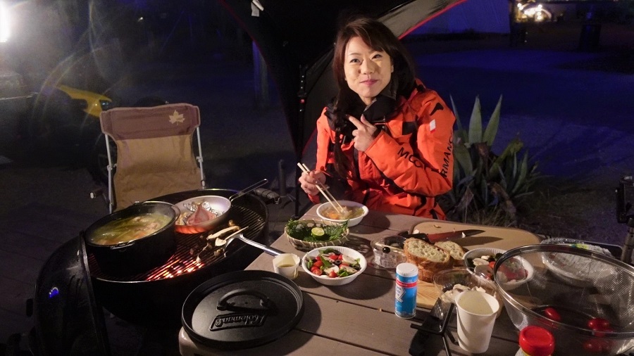 この日も遅くまでキャンプ飯を作って、食べて、かなり寒かったけど、KUSHITANIアロフトフードジャケットの防寒性能には驚きました。超絶寒がりの私が夜の野外でも笑顔でいられる、持っててよかった頼れる一着。
