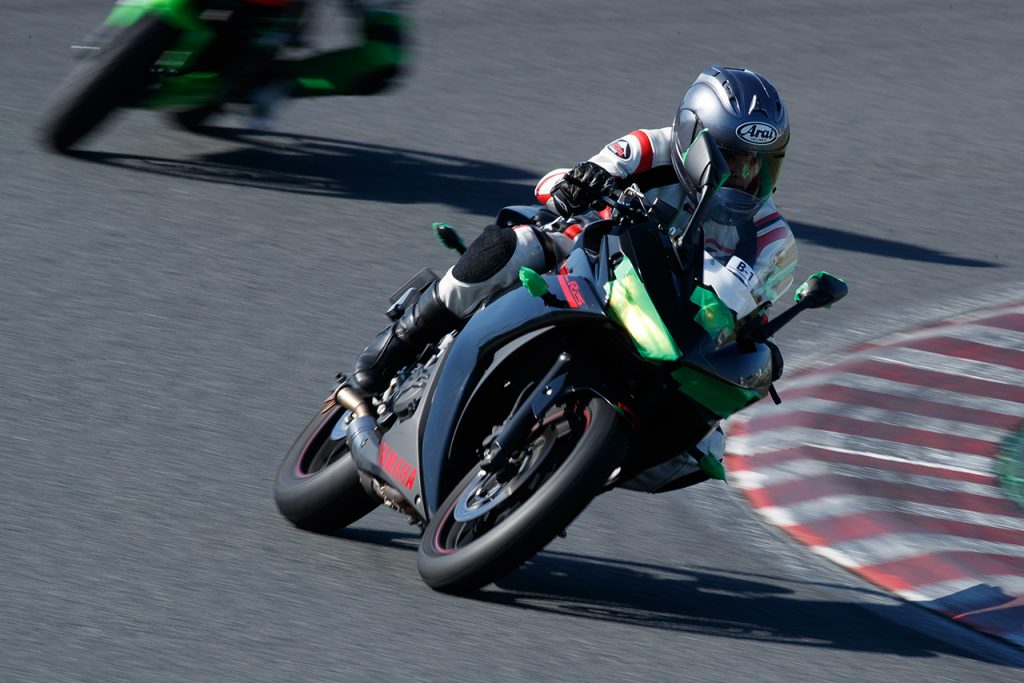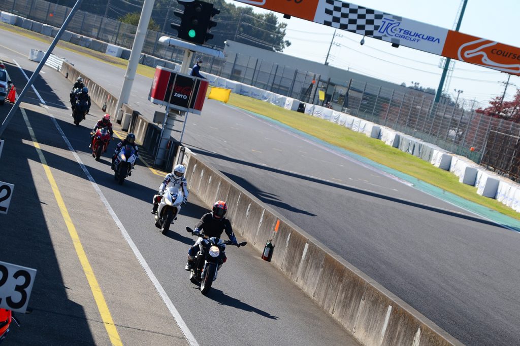 ライダースミーティングを終えたら、走行開始です。1本目の走行のスタートでは、すべてのクラスにインストラクターの先導が付きます。筆者もこの日、Bクラス(ビギナークラス。ゆったりと走れるフリー走行クラスです)で走りを堪能しました。筑波サーキットを走るのは難しい! けれどなぜかくせになる難しさです(笑)。