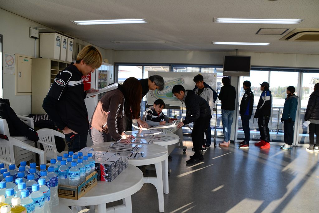 サーキットに到着したら、まず受け付けをすませます。ここではゼッケンシールやタイムスケジュール、そしてランチチケットなどがもらえます。ゼッケンシールは自分の車両に張ることをお忘れなく。そしてタイムスケジュールで、自分がどの時間帯で走行するのかを確認しておきましょう。