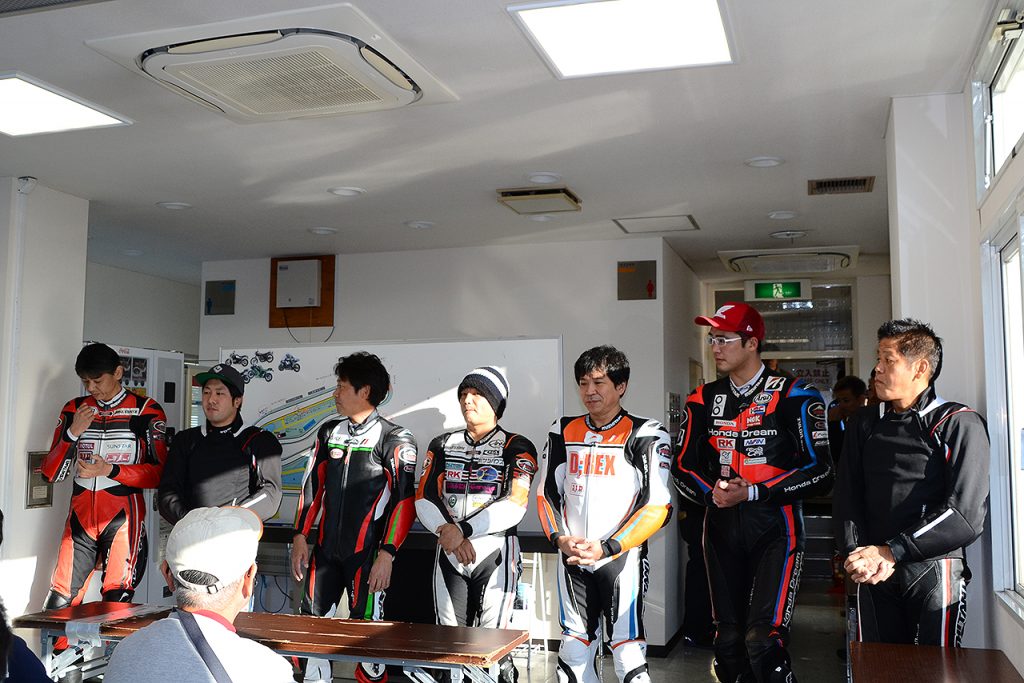 また、ライダースミーティングではこの日のインストラクターさんが紹介されます。どうです、この豪華インストラクター陣! 今回は、全日本ロードレース選手権JSB1000クラスに参戦する濱原颯道選手、ST600クラス2014年チャンピオンの小林龍太選手もインストラクターを務めました。