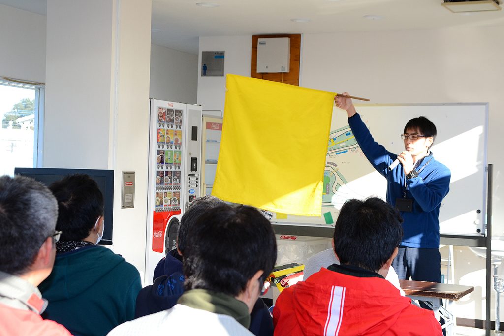 サーキットを走る上での注意点やフラッグの説明が行われる、と~~っても大事な大事なミーティングです。これに参加しないと、走行会に参加することはできません。走行前にどこに集合すればいいのか、走行中、フラッグが出たときにどのように対応すればいよいのか、などなど、とても大事なことが説明されます。ミーティングでの話を聞いた上で、もしわからないことや不安なことがあれば、走る前に必ずスタッフに確認を!