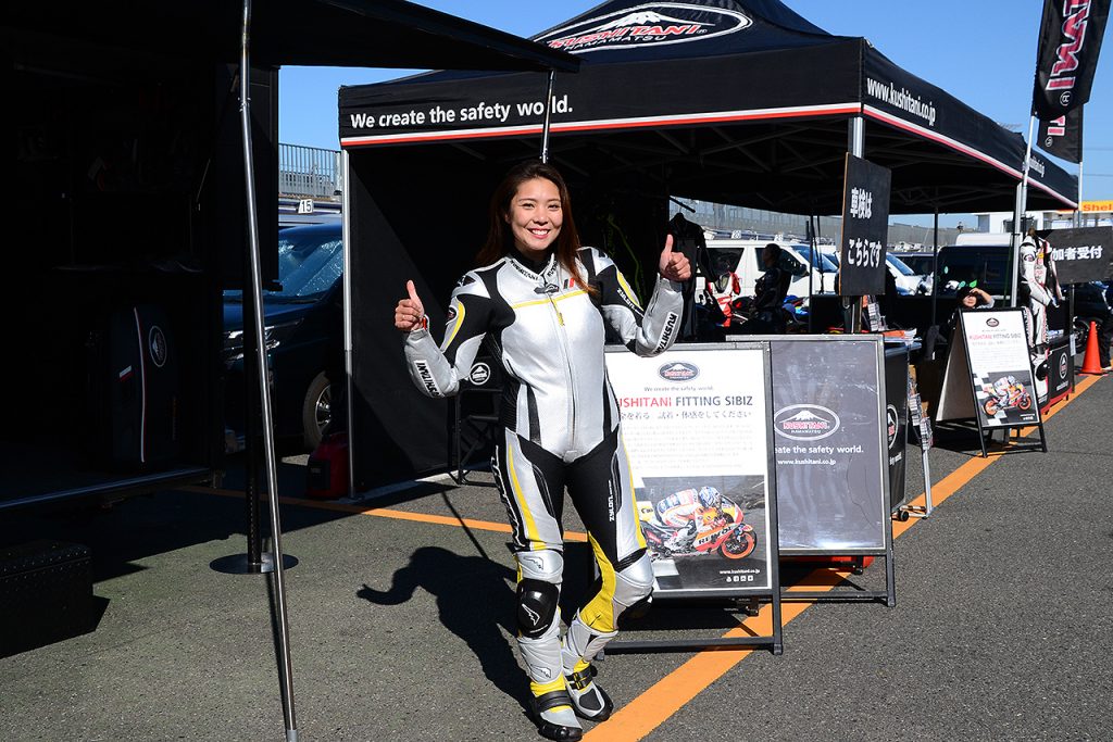 この日はLOGSにて、クロスカブで日本1周した様子をレポートしていたバイクタレント、下川原リサさんも参加していました。しかも、下川原さんオーダーのクシタニのレーシングスーツ、この日が初お披露目だったのだそう! なんでもカラーリングにとっても悩んだそうですが、シルバーの落ち着いたベースに差し色のイエローがすてきに映えていますね。