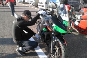 準備ができたら、車検場へ持っていって、サーキット走行にバイクの状態が問題ないかのチェックを受けます。また、今回はブリヂストンのブースで空気圧のチェックをしてもらうことができました。「サーキット走行をするのに空気圧をどうしていいのかわからない……」、そんなときも心配ご無用。タイヤのプロフェッショナルがいらっしゃるので、遠慮なく相談しちゃいましょう!