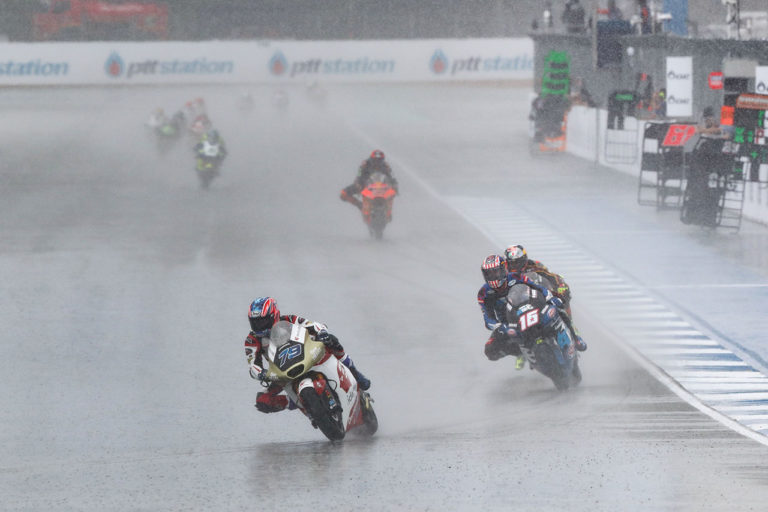 3年ぶりに開催されたタイGPは、アラゴンGP、日本GPに続く3連戦。特にMoto2™クラスの決勝レースでは、スタート直前に雨が降り、その後、激しい雨に見舞われてレースが赤旗終了となるなど、天候に翻弄されました。
